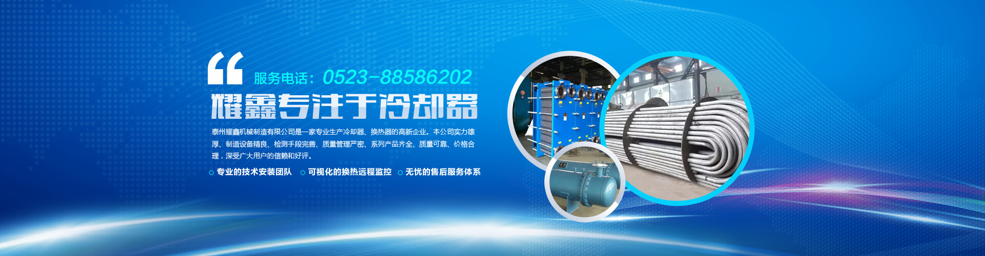 免費(fèi)咨詢(xún)方案 +泰州耀鑫機(jī)械制造有限公司座落于風(fēng)景如畫(huà)的江蘇魚(yú)米之鄉(xiāng)--全國(guó)文明城鎮(zhèn)婁莊鎮(zhèn),是一家專(zhuān)業(yè)生產(chǎn)風(fēng)冷卻器、列管式冷卻器、板式冷卻器的企業(yè)。本公司實(shí)力雄厚、制造設(shè)備精良、檢測(cè)手段完善、質(zhì)量管理嚴(yán)密、系列產(chǎn)品齊全、質(zhì)量可靠、價(jià)格合理,深受廣大用戶(hù)的信賴(lài)和好評(píng)。